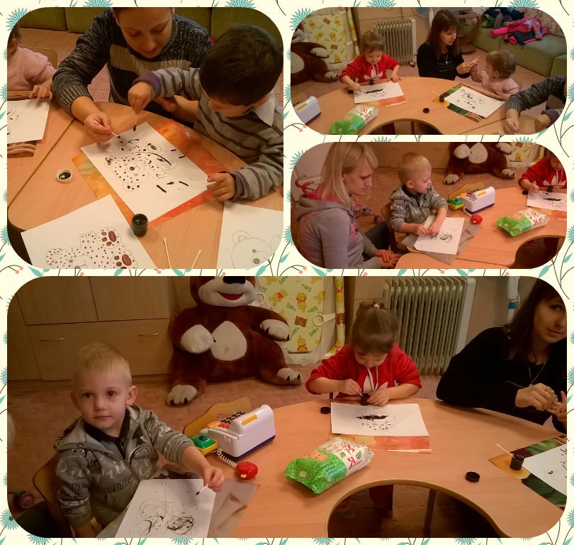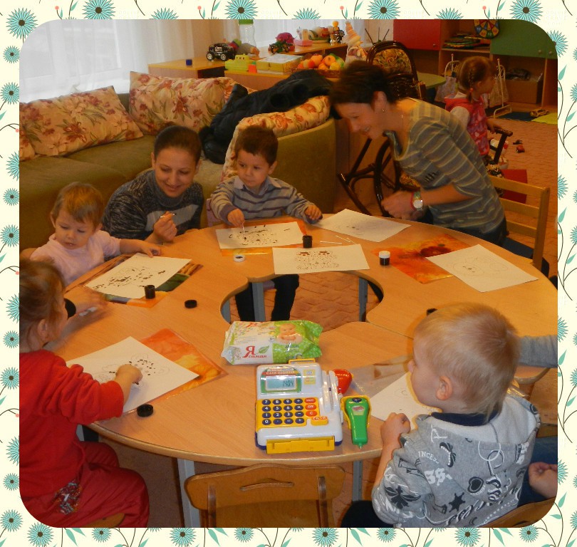 Уже без напоминания молодые мамы с детьми приходят на развивающие занятия в Центр. На этот раз дети вместе с мамами старались нарисовать весёлого медвежонка. Сначала детишки рассмотрели игрушку медведя, обратили внимание, какого цвета у него глаза, уши. И сразу захотели нарисовать друга Мишке. Придумали ему имя, а рисовали мишку методом «тычка».