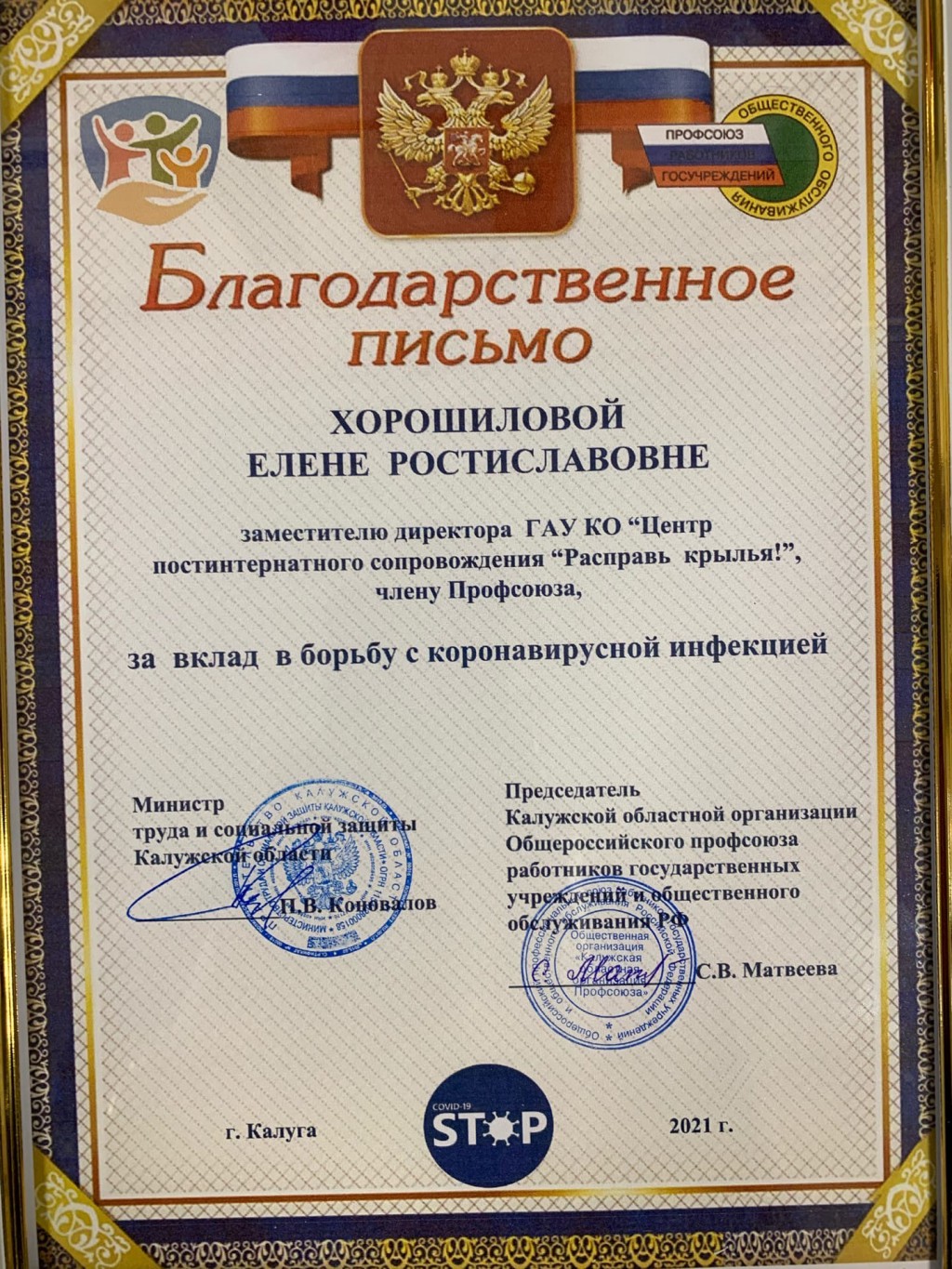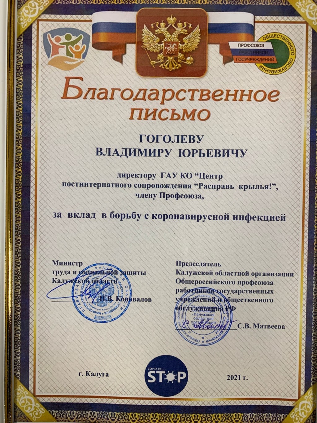 В День социального работника, Министр труда и социальной защиты Коновалов П.В. совместно с Председателем Калужского Областного Профсоюза Работников Госучреждений и Общественного Обслуживания РФ Матвеевой С.В. наградили директора центра Гоголева В.Ю. и заместителя директора по общим вопросам Хорошилову Е.Р. благодарственными письмами за вклад в борьбу с коронавирусной инфекцией!#РасправькрыльяКалуга #Калужскаяобласть #Калуга #Калужскаяобласть #КалужскийКрай #РасправьКрылья40
