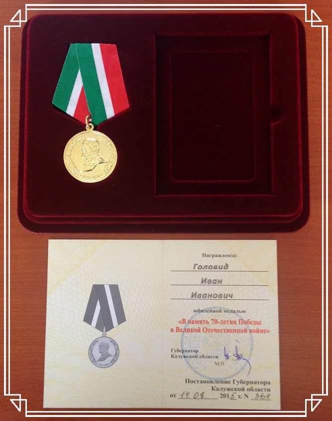 На основании постановления Губернатора Калужской области от 14 августа 2015 № 364 «О награждении юбилейной медалью Калужской области «В память 70-летия Победы в Великой Отечественной войне» за большой вклад в патриотическое воспитание подрастающего поколения и увековечение памяти погибших защитников Отечества Головид Иван Иванович, эксперт отделения комплексной помощи Центра постинтернатного сопровождения «Расправь крылья!», заместитель атамана Калужского отдельского казачьего общества Войскового казачьего общества «Центральное казачье войско» награжден юбилейной медалью Калужской области «В память 70-летия Победы в Великой Отечественной войне».