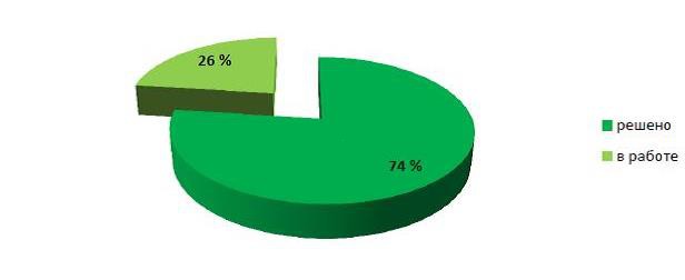 Всего за истекший период было выявлено 5710 случаев, в решении которых была необходимость. В настоящее время 74 % проблем решены, 26 % находятся в работе. (см. фото №3)