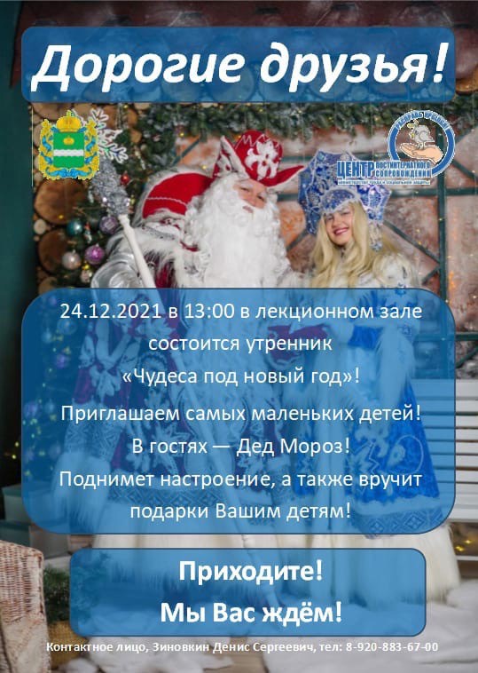 24 декабря в 13:00 в лекционном зале состоится утренник "Чудеса под новый год!" Приглашаем самых маленьких детей, у нас в гостях настоящий Дед Мороз, который поднимет волшебное настроение, а также вручит подарки детям. Приходите, мы Вас ждем!