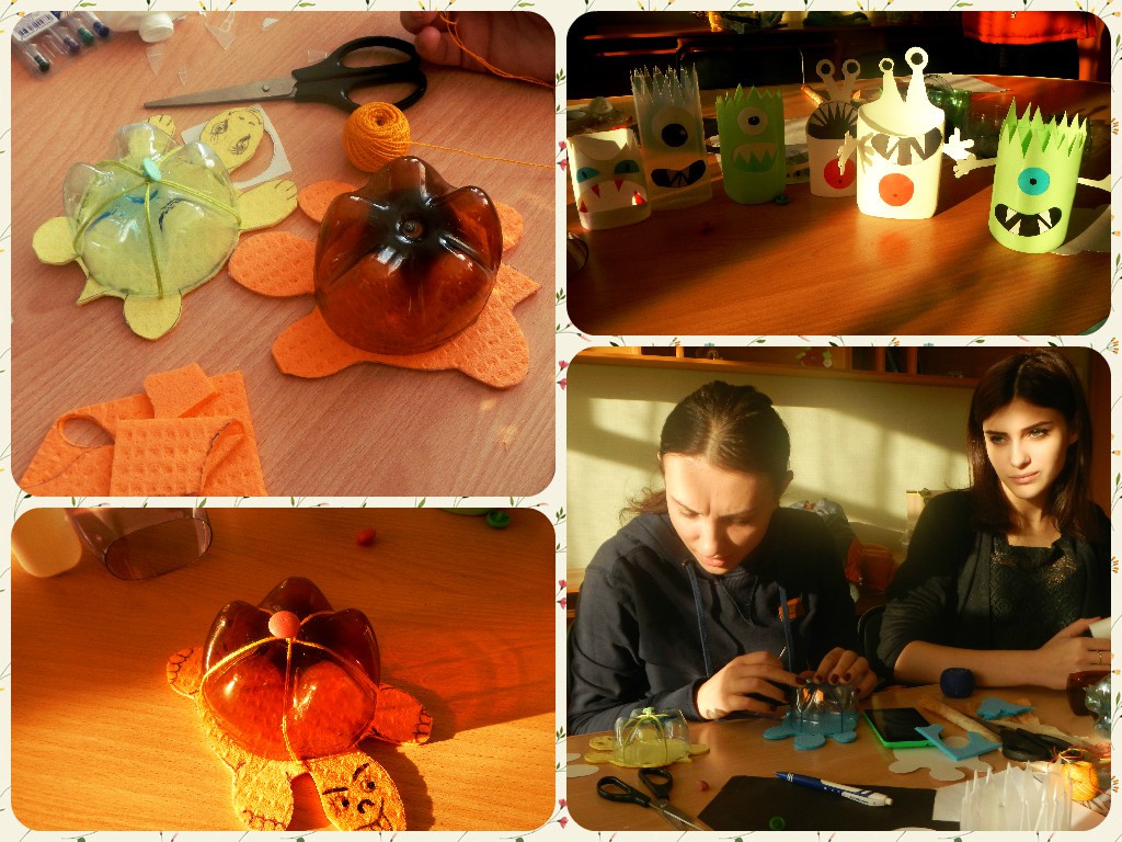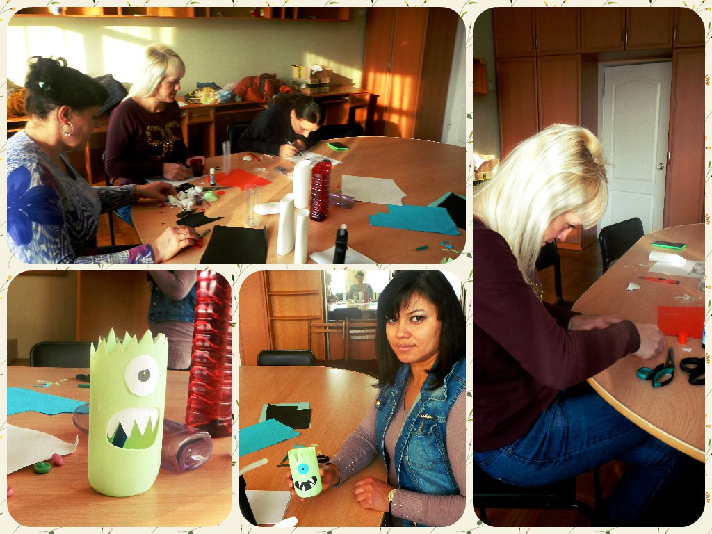 Этот мастер-класс, который Алина проводила с Ириной Бауэр, Настей Соколовой. Катей Каравашкиной, Леной Лемак показал, как из пустых бутылок от шампуня или другой бытовой химии сделать карандашницы в виде монстров.