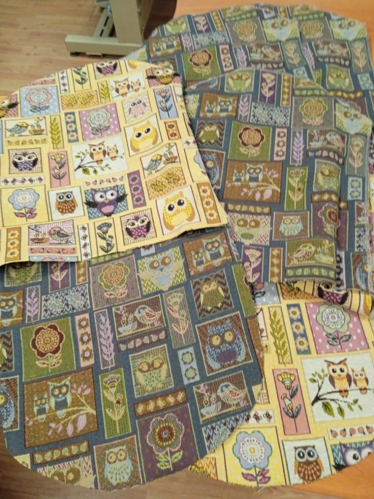 Шаг 4. Из гобелена, во всю ширину полотна отменяем высоту юбки стула. Вырезаем прямоугольник. Соединяем короткие стороны полотна, и обрабатываем оверлоком.