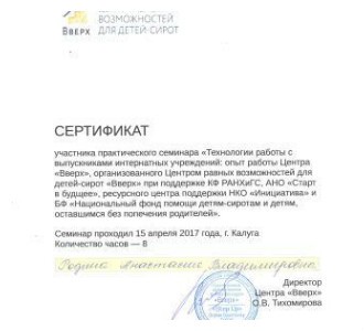 15 апреля 2017 года специалисты нашего Центра посетили семинар «Технологии работы с выпускниками интернатных учреждений, организованный Центром равных возможностей для детей сирот «Вверх».
