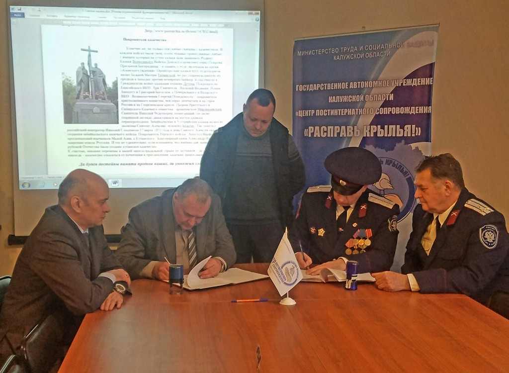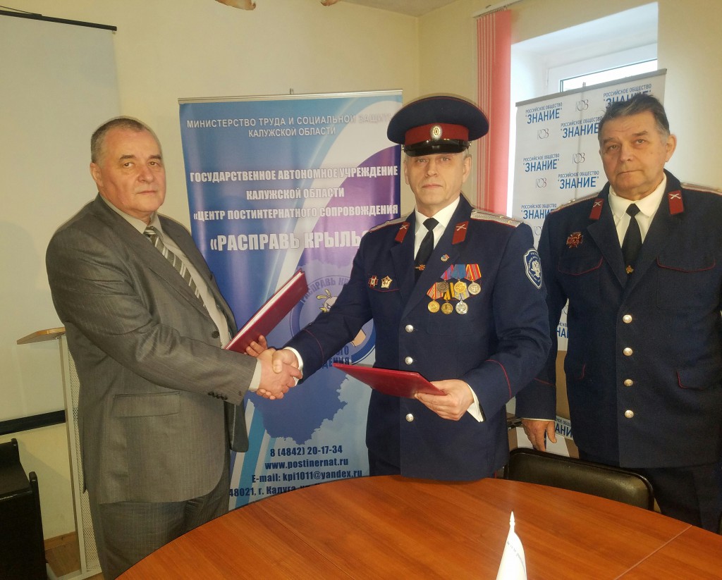 В рамках гражданско-патриотического и духовно-нравственного воспитания подписано соглашение о сотрудничестве и взаимодействии между Центром «Расправь крылья!» в лице директора В.Ю. Гоголева и Калужским реестровым городским казачьим обществом в лице атамана О.А. Глущук.