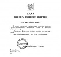 Президент РФ Владимир Путин подписал указ, согласно которому День семьи