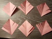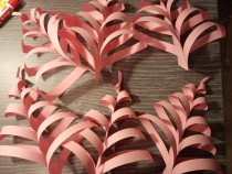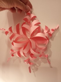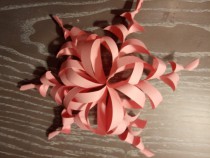 Для создания снежинки потребуется 6 листов цветной бумаги, простой карандаш, линейка, ножницы и клей. 1. Вырезаем 6 квадратов и складываем пополам. 2. Делим на равные по ширине полоски и разрезаем не доходя до края 0,5 см. Получаем 6 листочков. 3. Начинаем склеивать кончики каждой пары полосок. Четные полоски склеиваем по лицевой стороне, нечётные - переворачивая лист на другую сторону. Получили 6 ажурных фигурок. 4. Склеиваем их между собой за кончики. Украшение готово!