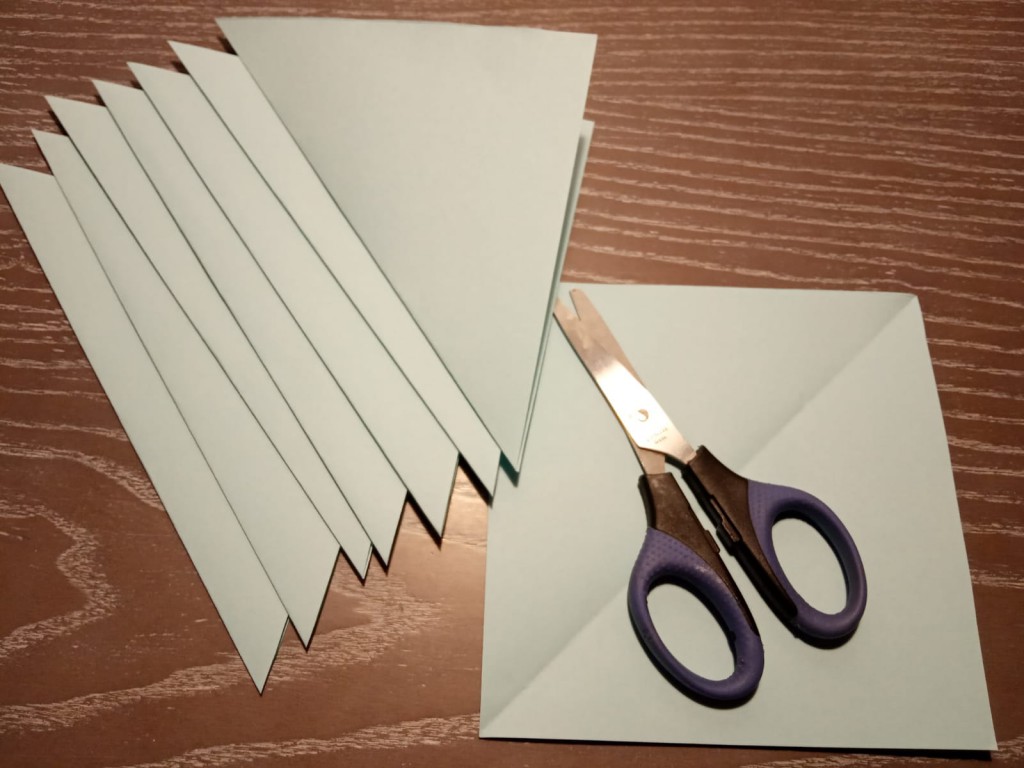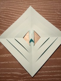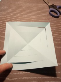 Для создания снежинки потребуется 4 листа цветной бумаги, клей, ножницы, простой карандаш и линейка. 1. Вырезаем 8 квадратов. 2. Складываем листы пополам и ещё раз пополам. 3. Делим на 4 равные по ширине части (показано линиями) и разрезаем не доходя до края 0,5 см. 4. Склеиваем за края внутренний квадрат. 5. Склеиваем уголки 3-го квадрата. 6. Переворачиваем лист и склеиваем остальные квадраты. Получается 8 фигурок. 7. Склеиваем их между собой за нижний край и боковые грани. Чудесная, ажурная снежинка готова!