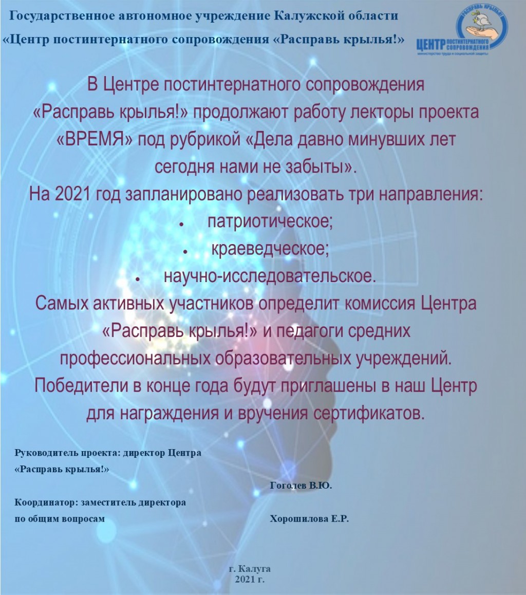 В целях реализации проекта "ВРЕМЯ" продолжается работа лекторской группы. Приглашаем студентов средних специальных образовательных учреждений города Калуги и Калужской области принять участие в совместной деятельности. По вопросам участия обращаться к координатору проекта Елене Ростиславовне Хорошиловой, тел. 8-902-933-00-75