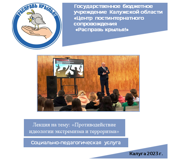 Специалисты Центра «Расправь крылья!», провели мероприятие на тему: «Противодействие идеологии экстремизма и терроризма», в «Калужском колледже сервиса и дизайна», по вовлечению молодежи (в том числе детей-сирот), в систему патриотического воспитания и выполнения государственного задания.