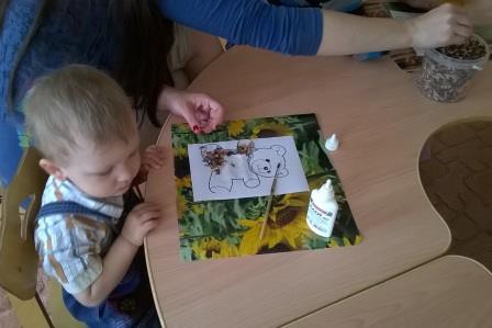 Из кусочков ниток участники школы сделали самого настоящего медвежонка. Эта техника приклеивания готовых ниток была совершенно незнакома мамам.