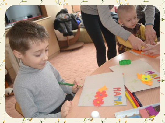 Дети сделали замечательные открытки для мам с использованием пластилина, цветной бумаги и картона которые они подарили своим любимым мамам. Это Валерочка Гладких, Арсений Ермаков, Сергей Хромых, Данила Тимошкин, Максимка Ломакин.