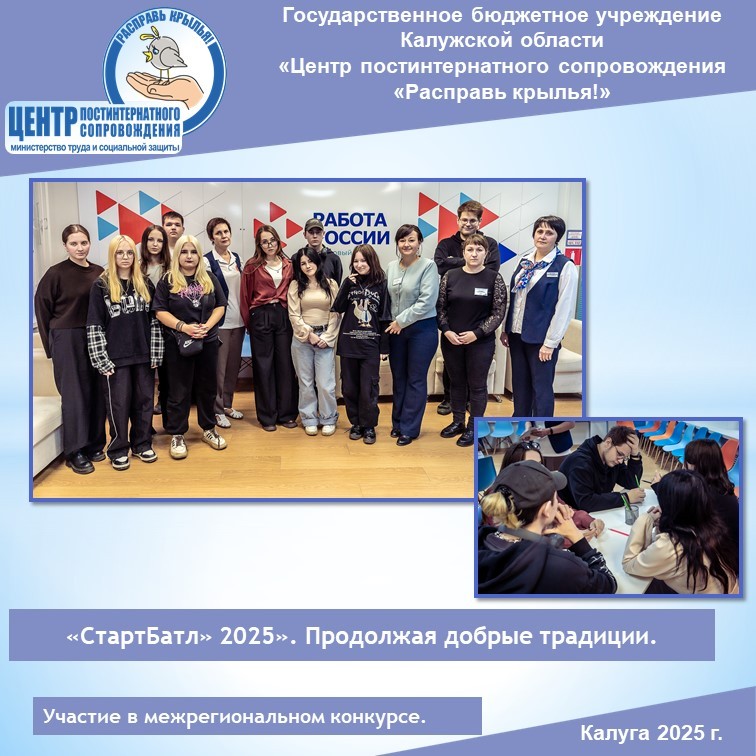 В Калуге прошел «СтартБатл 2025» – межрегиональный конкурс воспитанников организаций для детей-сирот и детей, оставшихся без попечений родителей. Изначально конкурс «СтартБатл» организовывал Благотворительный фонд «Расправь крылья!» г. Москва при участии нашего Центра. Продолжая добрую традицию, Центр «Расправь крылья!» с 2016 года принимает участие в этапе «СтратБатл» в г. Калуга для выпускников детских домов и школ-интернатов области, для студентов СПОУ.