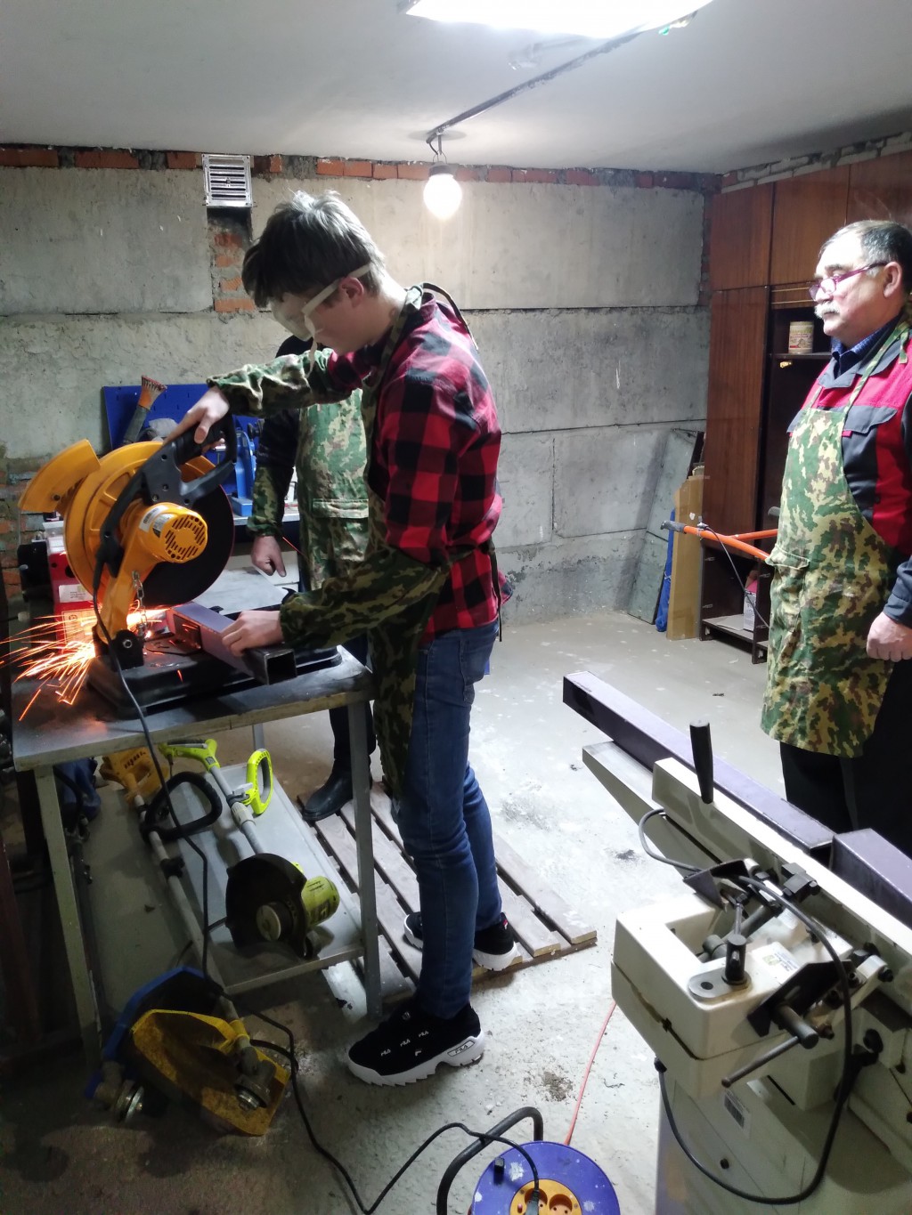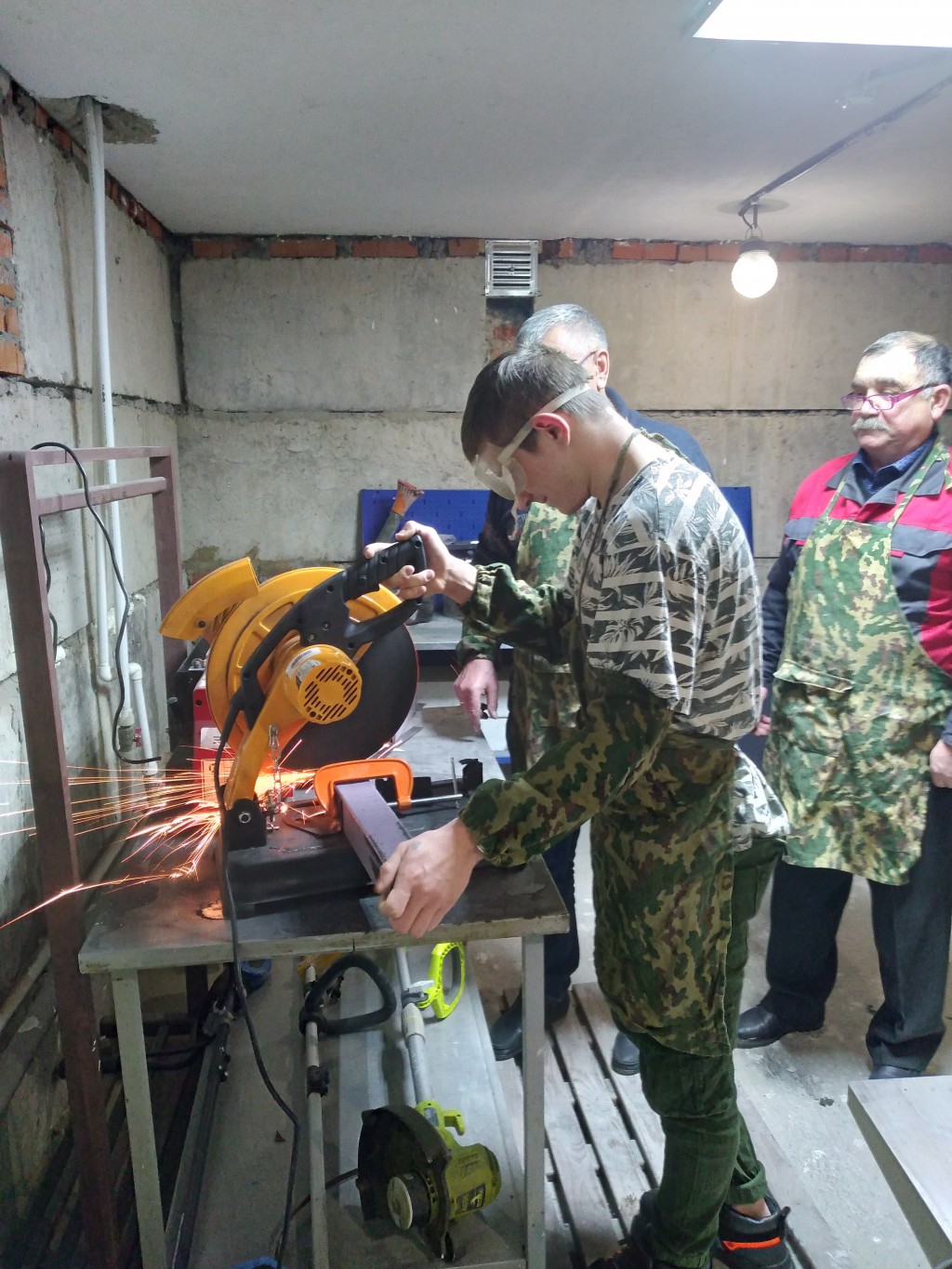 В первую очередь ребятам было рассказано о мерах безопасности при проведении сварочных работ, дана теория о видах сварки, наглядно продемонстрированы способы сварки. Далее перешли к практической части - изготовлению металлического стола. Зачистка деталей, сборка и закрепление их при помощи струбцин. Работы проводились с помощью отрезной пилы ОП-355/2500 «ВИХРЬ», металлической линейки, уголков, болгарки. В процессе проведения занятия ребята получили понятие о конструировании различных деталей из металла, об измерительных инструментах, применяемых при этом, о сварочных работах, о видах и способах сварки, об устройстве и работе сварочного оборудования.