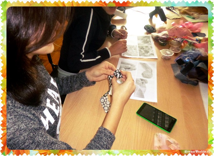 Для того чтобы сделать какое-либо украшение бохо, много усилий или особой техники не понадобится, поэтому следующее занятие по рукоделию нашего мастер Алины было посвящено тому, как сделать брошки в стиле Бохо. С каким удовольствием Наташа Гладких, Настя Соколова и Лена Лемак приступили к изготовлению брошки. Материал подручный, только фантазия девушек и консультации педагога. Процесс изготовления поделок своими руками приносит только удовольствие.
