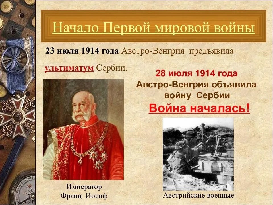 В этот день началась Первая мировая война - один из самых широкомасштабных вооружённых конфликтов в истории человечества (28 июля 1914 – 11 ноября 1918). Непосредственным поводом к войне послужило Сараевское убийство 28 июня 1914 года австрийского эрцгерцога Франца Фердинанда сербским студентом Гаврилой Принципом, членом тайной организации «Млада Босна», боровшейся за объединение всех южнославянских народов в одно государство. Этот факт сам по себе не был угрожающим миру. Мировая пресса оценила его сначала сравнительно спокойно, народ отнёсся к нему с безразличием. Реакция в дипломатических кругах была сдержанной. Однако австрийские и германские правящие круги решили использовать сараевское убийство как предлог для войны. 5 июля Германия обещает поддержку Австро-Венгрии в случае конфликта с Сербией. 23 июля Австро-Венгрия, заявив, что Сербия стояла за убийством Франца Фердинанда, объявляет ей ультиматум, в котором требует от Сербии выполнить заведомо невыполнимые условия. Среди них – чистка госаппарата и армии от офицеров и чиновников, замеченных в антиавстрийской пропаганде; арест подозреваемых в содействии терроризму; разрешение полиции Австро-Венгрии проводить на сербской территории следствие и наказание виновных в антиавстрийских действиях. На ответ было дано всего 48 часов. В тот же день Сербия начинает мобилизацию, однако, соглашается на все требования Австро-Венгрии, кроме допуска на свою территорию австрийской полиции. Германия настойчиво подталкивает Австро-Венгрию к объявлению войны Сербии. 25 июля Германия начинает скрытую мобилизацию. 26 июля Австро-Венгрия объявляет всеобщую мобилизацию и начинает сосредоточивать войска на границе с Сербией и Россией. 28 июля 1914 года Австро-Венгрия, заявив, что требования ультиматума не выполнены, объявляет Сербии войну. Россия заявляет, что не допустит оккупации Сербии. 30 июля мобилизация начинается во Франция. 31 июля в России объявлена всеобщая мобилизация в армию. В тот же день Германия предъявляет России ультиматум: прекратить призыв в армию, или Германия объявит войну России. Франция, Австро-Венгрия и Германия проводят мобилизацию. Германия стягивает войска к бельгийской и французской границам… В результате войны прекратили своё существование четыре империи: Российская, Германская, Австро-Венгерская и Османская. Страны-участницы потеряли около 10 млн. человек убитыми, 22 млн. были ранены.