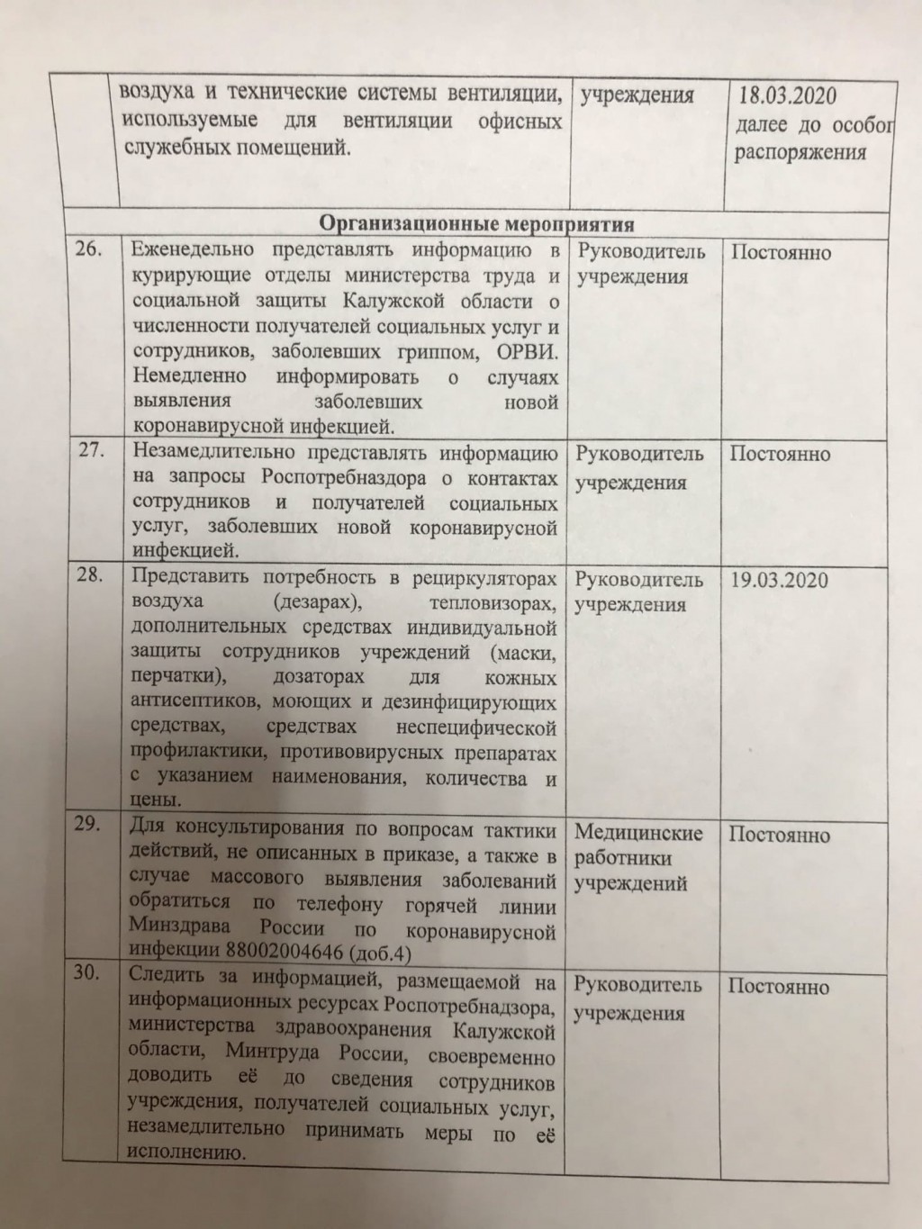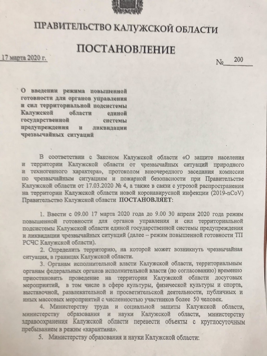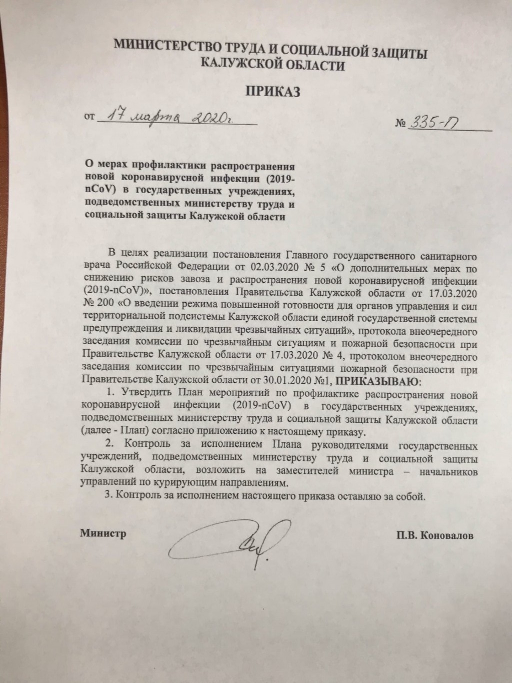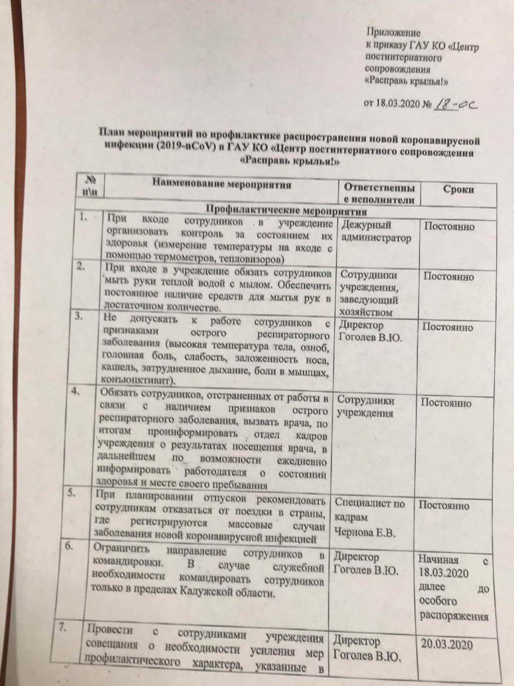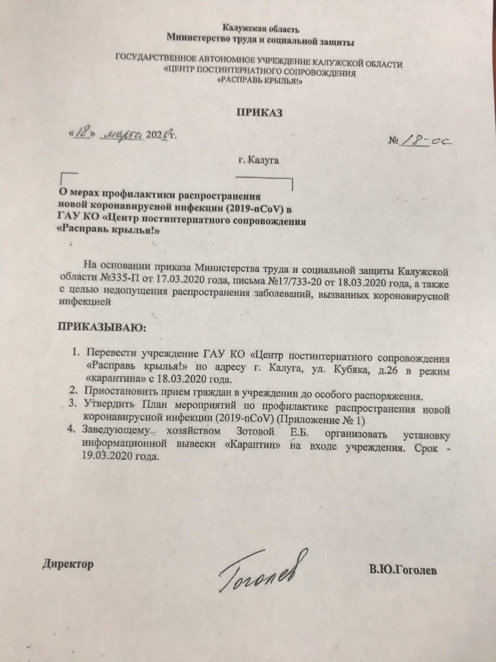 В соответствии с ПОСТАНОВЛЕНИЕМ ПРАВИТЕЛЬСТВА КАЛУЖСКОЙ ОБЛАСТИ от 17 марта 2020г. №200 «О введении режима повышенной готовности для органов управления и сил территориальной подсистемы Калужской области единой государственной системы предупреждения и ликвидации чрезвычайных ситуаций» и Приказом МИНИСТЕРСТВА ТРУДА И СОЦИАЛЬНОЙ ЗАЩИТЫ КАЛУЖСКОЙ ОБЛАСТИ от 17 марта 2020г. №335-п «О мерах профилактики распространения новой коронавируснойинфекции в государственных учреждениях, подведомственных министерству труда и социальной защиты Калужской области» ГАУ КО «Центр постинтернатного сопровождения «Расправь крылья!» закрыт на карантин с 18.03.2020г. до 03.04.2020г.
