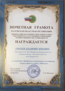 16 августа 2020 года исполнилось 30 лет Калужской областной организации Общественного профессионального союза работников государственных учреждений и общественного обслуживания РФ. В связи с этим ХI Съезд Профсоюза 26 сентября 2020 организовал праздничное мероприятие, в рамках которого наградили директора Центра «Расправь крылья!» Владимира Гоголева Почетной грамотой за содействие Профсоюзу в реализации его уставных целей и задач в связи с юбилейной датой. Вместе с Почетной грамотой обкома Профсоюза была вручена выплата денежного вознаграждения. Также была организована экскурсия в один из самых крупных в Европе и крупнейший в России музей ретро-автомобилей и антикварной техники: «Музей техники Вадима Задорожного».