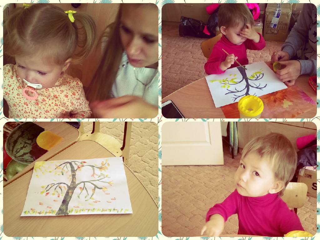 На другом занятии дети рисовали листопад способом «примакивания». Педагог провел консультации для мам на темы: «Что нужно читать детям», «Учим замечать прекрасное». Полинка Дашина, которая решилась после праздника летних именинников посещать занятия, никак не хотела уходить с занятий. Гордая, держа в руках поделки, пошла домой. Мама сказала, что теперь всегда будут приходить к нам. До новых встреч! Мы рады видеть у себя Вас, милые мамы и детки!