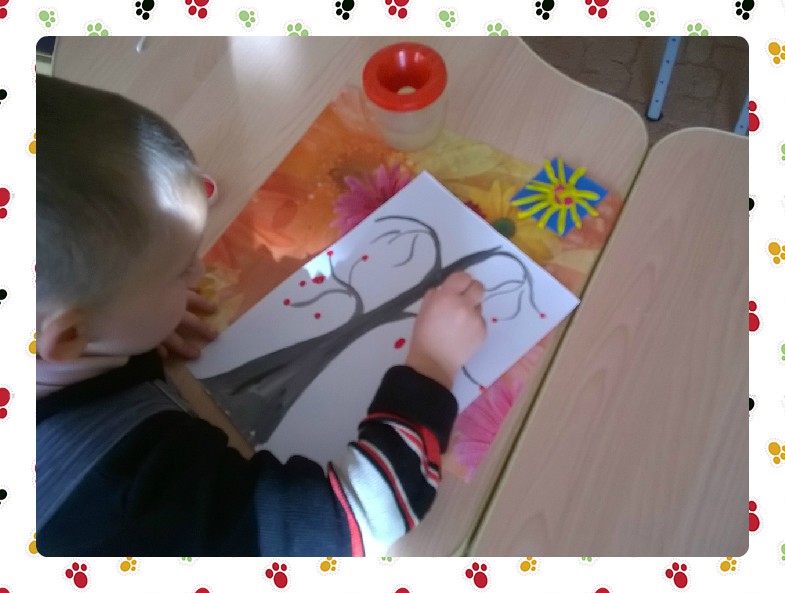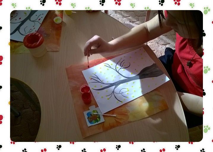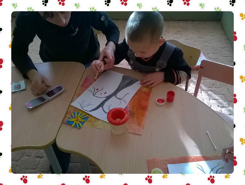 Темы занятий все связаны с осенью. Юля Владимировна обратила внимание детей на погоду за окном, вместе с ними закрепила признаки осени (холодно, пасмурно дует прохладный ветер и т.д), вместе рассмотрели картинки, и педагог предложила нарисовать дерево и осенний листопад, при этом показала способ работы методом «тычка». Данилка, Саша, Полина, Максимка трудились, не покладая рук.